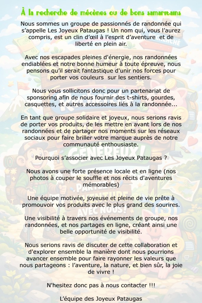 Dans notre catalogue dominical : randos courtes ou longues, plus ou moins pentues, vous sont proposées, et cela, gratuitement !!! Les seules monnaies d’échange que nous acceptons, sont votre bienveillance, votre convivialité et votre bonne humeur !!! Ajoutez votre sourire et nous serons conquis !!!