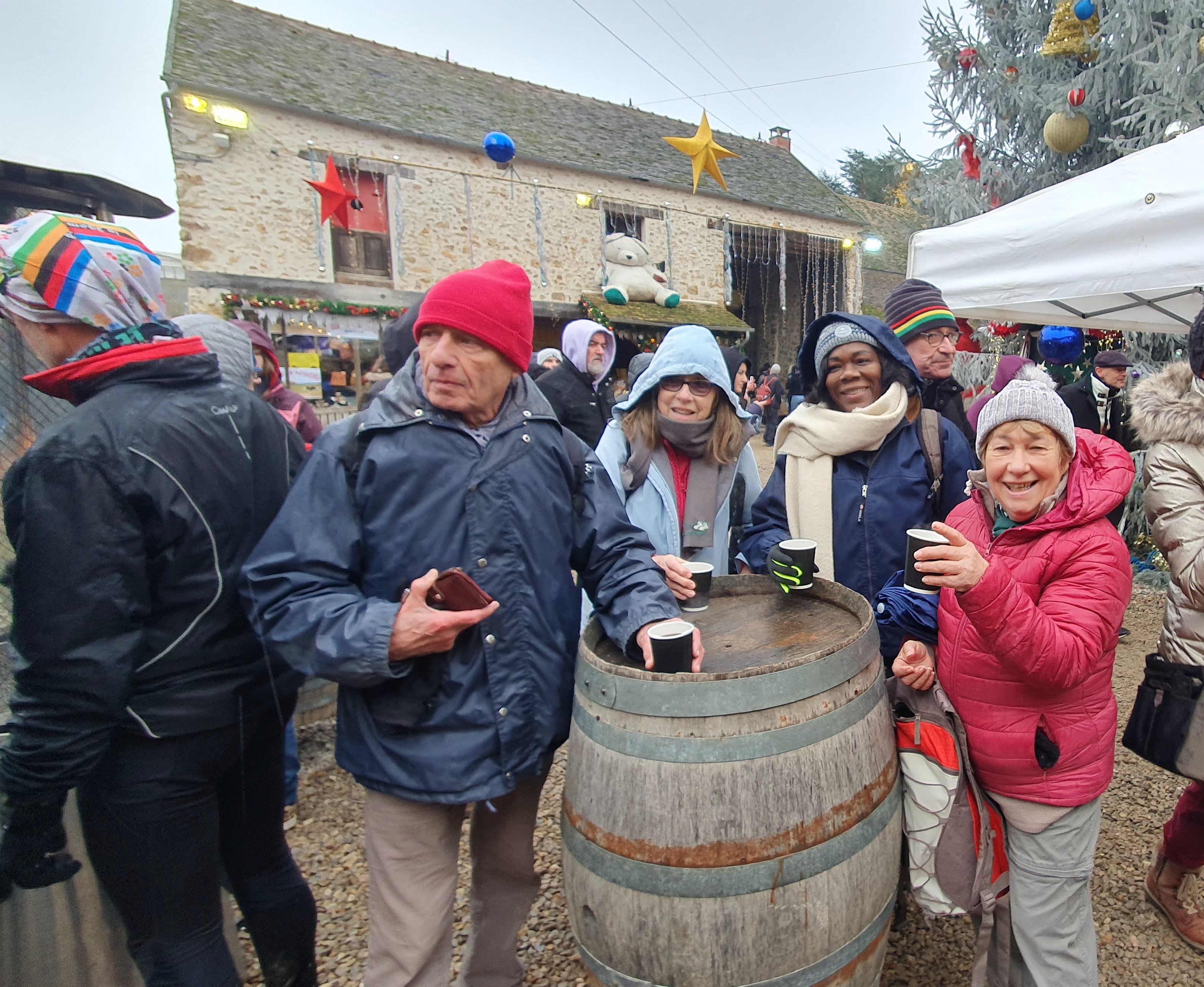 Quoi qu’il en soit, voilà Les Joyeux Pataugas sur le GRP Les Vallées de l’Essonne, jalonnant au travers du Fonds de Saint-Vandrille, enjambant La Salmouille puis arpentant le Bois du Chef, avant celui de l’Hôtel Dieu pour …enfin, …enfin, à l’entrée de Janvry, humer quelques effluves de cannelle, de marrons chauds, de pain d’épices, d’oranges et de clous de girofles… Il faut avouer que les sens des Joyeux Pataugas avaient été fort aiguisés et conditionnés par la pléiade de coureurs de running et de trail croisés… qui détalaient tous sur un même objectif… le vin chaud !!! Donc qu’auraient pu sentir d’autre, les Joyeux Pataugas !!! D’ailleurs c’est illico-presto qu’ils se sont tous rués sur l’échoppe du vin chaud !!! Avec bien sur la p’tite crêpe ou la gauffre brûlante pour l’accompagner !!! Un vrai régal… bien au dela de la traditionnelle banane !!! Et ce Marché de Noël de Janvry… magnifique et superbement bien achalandé… plus de 140 exposants… imaginez !!! Une trouvaille pour celles et ceux des Joyeux Pataugas qui ne connaissaient pas !!!