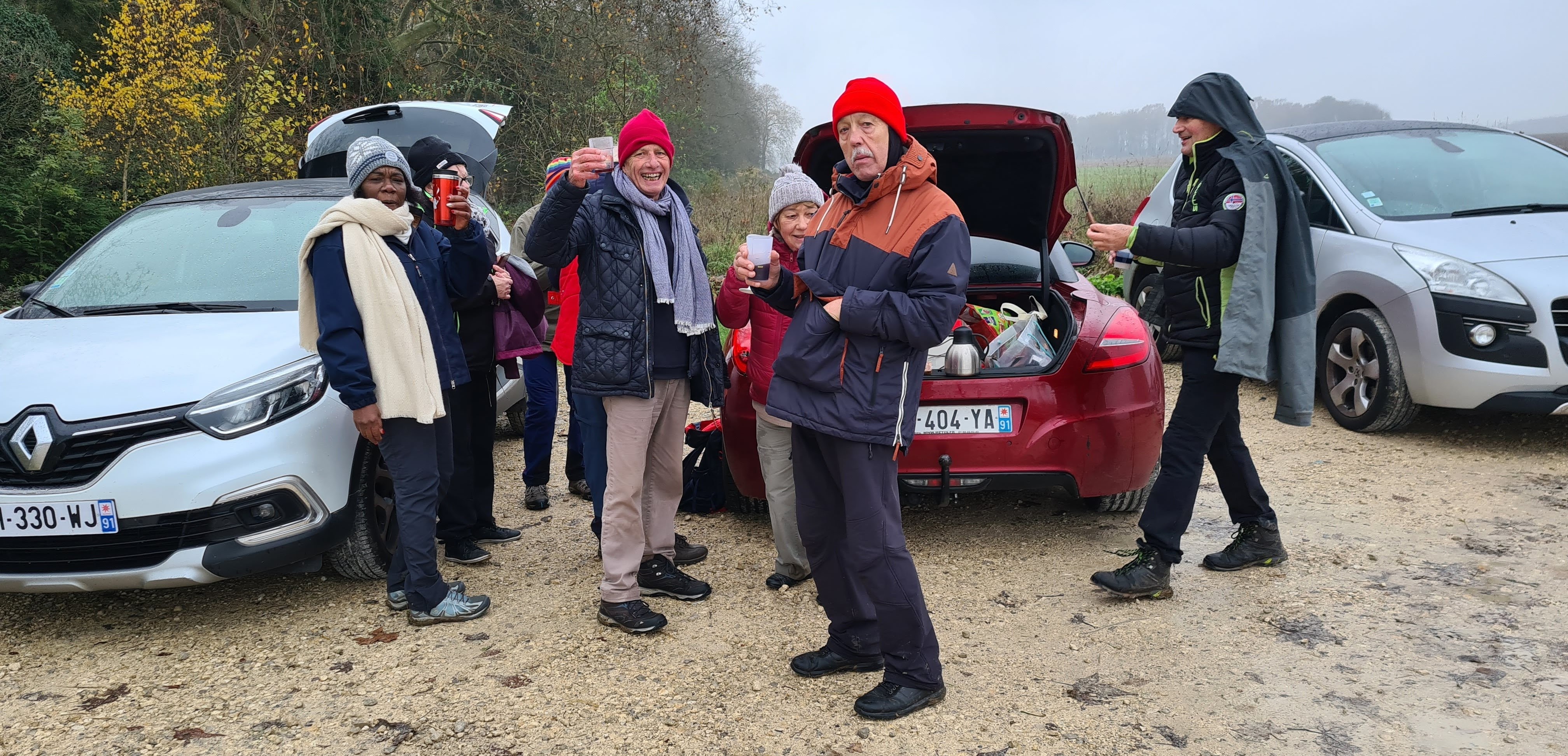 Un p’tit point sur les conditions météorologiques de ce dimanche… un temps hivernal, froid, gris…, totalement hors course avec une couette douillette !!! En sachant, au moment même, où les courageux Joyeux Pataugas s’apprêtaient à partir, un petit grain, certes éphémère est venu les glacer !!! Un moment la question s’est posée… de savoir si c’était bien raisonnable d’enclencher cette randonnée… Mais là aussi… cela a été très furtif !!! Pour tout vous avouer, les accompagnatrices, Audrey et Jacqueline, ont prévu… une halte au traditionnel et populaire Marché de Noël de Janvry…. Peut être que nombreux avaient en tête ou plutôt déjà en bouche, le goût d’un bon vin chaud !!! Inutile de vous rappeler l’expression « Marcher à la carotte » !!!