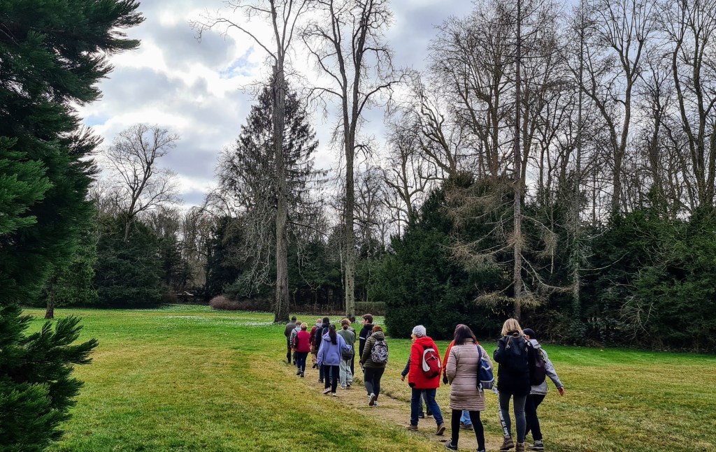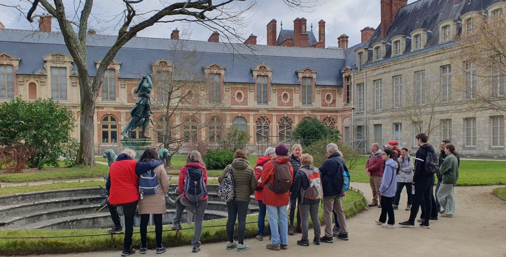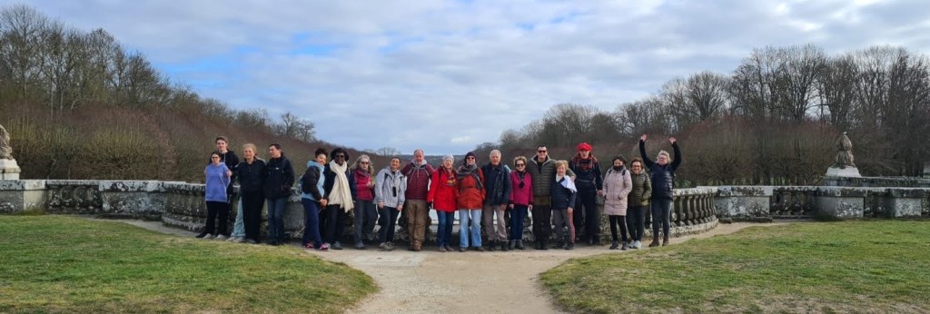 Ce dimanche 19 février 2023, Les Joyeux Pataugas rentrent dans l’histoire, ils sont invités à la Maison de Famille des Rois de France, au Château de Fontainebleau, plus principalement en son parc et ses dépendances. Seul endroit royal et impérial à avoir été habité sans discontinuité pendant 7 siècles. Et c’est Madame de Maintenon, la seconde épouse de Louis XIV qui les accueille en personne, à sa grille. Pourtant, ne croyez que comme au temps jadis, via cette porte, Les Joyeux Pataugas vont partir pour une chasse à courre royale sur le mail Henri IV vers le Mont Chauvet !!! Et n’attendez pas non plus, qu’ils s’adonnent au jeu de mail comme autrefois !!! Que nenni, nos 22 Joyeux Pataugas du jour, sont venus, pour leur rituel dominical, la marche… enfin pour ce dimanche, nous parlerons plus d’une p’tite ballade !!!
