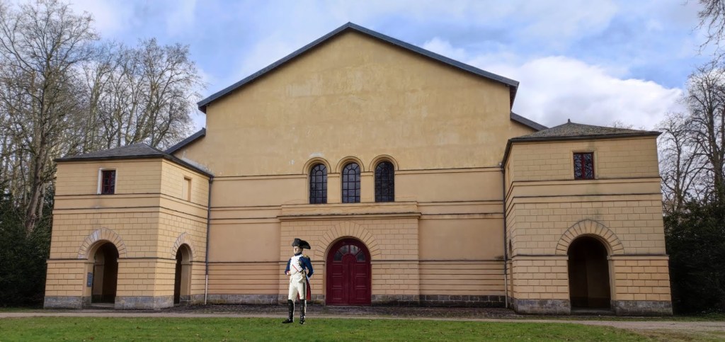 Mais qui se dresse au loin, fièrement, avec un « petit chapeau », une main plongée dans son gilet et un grand sourire aux lèvres devant ce bâtiment !!! A l’unisson, tous Les Joyeux Pataugas clament « Le Petit Caporal !!! » qui semble de meilleure humeur que lors de leur première confrontation dans la Cour d’Honneur oh… pardon… dans La Cour des Adieux !!! Il est venu à la fois pour saluer et remercier la Cour des Joyeux Pataugas pour sa venue, clore leur ballade historique, mais aussi présenter son Manège Sénarmont, construit en 1807 dans ce quartier dit du Carrousel, mis à la disposition des armées en 1871 et qui abrite aujourd’hui le Centre Sportif d’Equitation Militaire. Le manège fait l’objet aujourd’hui d’un partenariat de mise en valeur entre les ministères de la Culture et de la Défense. !!!