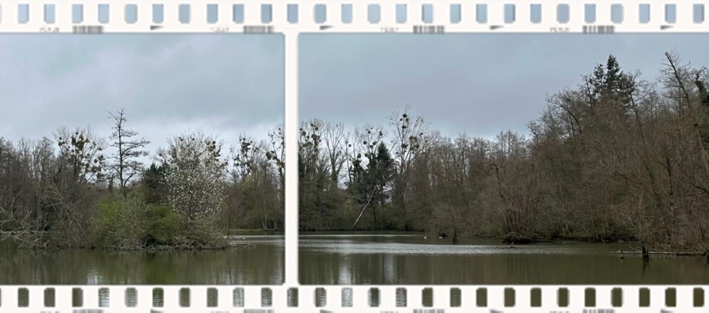 Rue du Potelet, changement de décor…, pour un raccord menant sur le Chemin du Mesnil, où là, Audrey entraine ses acteurs dans une séquence plus boisée. Si ses repérages prévoyaient la continuité sur le Chemin du Milieu, là voilà qui opte pour un nouvel angle de vue en bifurquant à droite pour une scène de répliques mêlant Les Joyeux Pataugas au lieu-dit Les Fontaines Bouillonnantes !!! Mais contrairement au nom, ces étangs ne sont pas des sources d’eau bouillonnantes ou encore des sources d’eau chaudes qui pourraient se prêter à quelques scènes dénudées, et valoir le retour du petit carré blanc !!! Ce sont en fait, des zones humides abritant une multitude d’espèces d’oiseaux et d’insectes. Donc inutile à Closer, Gala et consorts de chercher dans l’album photos des Joyeux Pataugas, quelques clichés hardis.