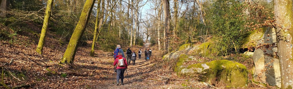 Soyez rassuré Monsieur Denecourt tout ce beau monde a bien passé la brèche !!! Certes on a assisté à quelques frottements de part et d’autres, mais sans peine et sans pleurs de part de la gente féminine. Puis les Joyeux Pataugas ont traversé la Grande Galerie et sont descendus dans la Vallée Proscrite. Enclave qui comme vous le savez, sera pratiquement quittée aussitôt pour de nouveau, une petite montée tortueuse !!! C’est aux environs de la Roche François Copée, le poète dramaturge et non le politicien, que Les Joyeux Pataugas font encore preuve de félonie en abandonnant votre sentier bleu 11 est !!! Le pretexte d’un clin d’œil avec la Plaine Verte, le point départ que vous préconisez, ne semble pas vous convaincre !!! Il est vrai que c’est aussi le chemin le plus rapide pour regagner l’arrivée !!! Pourtant c’est piane-piane que, par la Route de la Plaine Verte et celle des Grandes Vallées, Les Joyeux Pataugas rejoignent le Bivouac de Bourron-Marlotte !!! Il est quand même déjà 12h15, et certes le kilométrage n’est pas glorieux, à peine 7 km … mais comme le savez fort bien Monsieur Denecourt, qui va lentement va surement !!!