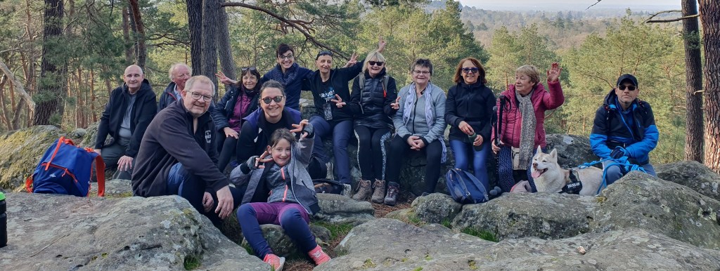 Il est 11 heures, lorsque Les Joyeux Pataugas, foulent cet inouï plateau du Restant du Long Rocher. Honneur est donné en premier au panorama sud, ensuite vient la Grotte Béatrix, qui doit son nom à une belle Florentine dont a été amoureux le poète italien Dante Alighieri et où bien sûr, les Joyeux Pataugas ne manquent pas de poser et de s’immortaliser !!! Puis c’est au tour du long point de vue sud d’être assiégé et contemplé… Sincèrement, Monsieur Denecourt, respect !!! Il aurait été dommage de priver les amoureux de la forêt bellifontaine de ces vues !!! D’ailleurs voyez comme Les Joyeux Pataugas ravis, posent ici et là, même Raïka, la chienne husky paonne, sidérée par le spectacle !!!
