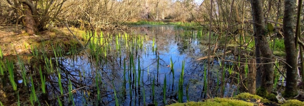 Inutile de vous préciser, Monsieur Denecourt, que c’est par une sente à gauche, que Les Joyeux Pataugas ont repris contact avec vos p’tits traits de la couleur bleu des uniformes de l’armée napoléonienne où vous avez servi, et cela, un peu avant l’intersection avec le Chemin du Chêne Pinguet. Et que quelques mètres plus loin, ils sont tombés nez à nez avec l’une des plus célèbres mares de platières de la Forêt de Fontainebleau, La Mare aux Fées ! Sachez Monsieur Denecourt, qu’elle est comme vous l’avez toujours connu, jamais asséchée, et Dieu sait, qu’à notre époque, la sécheresse et le réchauffement climatique sévissent !!! Et oui, Monsieur Denecourt, votre belle forêt souffre !!!
