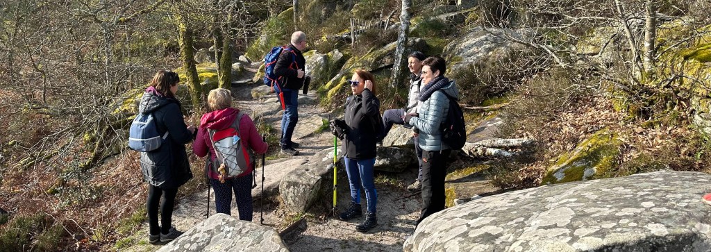 Enfin voilà vos hôtes, Monsieur Denecourt, sur ce Rocher des Etroitures, et la quête de vos p’tits coups de crayon bleu est confié à Stéphane !!! A lui de mener la troupe sur ce sentier escarpé et rocailleux jusqu’à la Route des Etroitures. Et n’ayez crainte, Monsieur Denecourt, le Joyeux Pataugas est parfaitement rodé pour faire deux choses à la fois, c’est à dire marcher et apprécier le paysage !!! C’est donc pianissimo et les yeux grands ouverts qu’il va arpenter votre sentier, surtout que ce matin y règne une magnifique luminosité. Et puis le Joyeux Pataugas, ne court après aucun record, il est là le dimanche matin pour avant tout se ressourcer, méditer en mouvement et surtout apprécier et regarder !!! Alors imaginez bien qu’une fois arrivés, au point de vue Saint-Hilaire, ils n’ont pas manqué de se poser et d’écarquiller leurs mirettes… Ensuite et en toute confidence, Monsieur Denecourt, faute à une montée en température commune, on a assisté également à un strip-tease collégial mais je vous rassure, aucun rocher n’en a rougi !!!