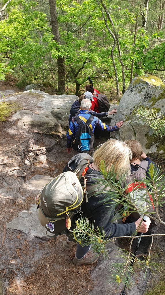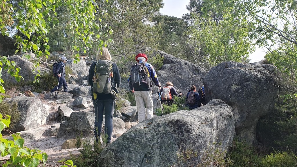 Au parking des Trois Pignons à Noisy sur Ecole, est présente ce jeudi, à l’heure dite, non pas la bande à Puck mais une bandelette de Joyeux Pataugas prêt à relever le défi… Et quel défi !!! Car si la bravade de ce Chapitre 1 est amoindrie, elle ne recense sur le circuit prévu, pas moins de 12 bosses, du mont Pivot au Rocher du Gros Sablons… avec un retour par le Chemin de la Plaine de Jean des Vignes via celui de la Gorge aux Poivres !!! 8,5 km avec un dénivelé cumulé pas loin à vol d’oiseau des 500 m !!! Et lorsqu’on sait que 100 mètres de dénivelé rajoute l’équivalent de 1km à pied en terme de distance… et que le terrain des 25 bosses est des plus accidenté… vous vous doutez, qu’il est le content et fier de ses ouailles, le Francky, votre narrateur et accompagnateur du jour !!! Voir…se pointer, hilares comme toujours, au départ de ce chapitre, pas moins de 11 Joyeux Pataugas de 46 ans à 81 ans avec en prime une petite nouvelle, Noelle, amenée pour son bizutage par Monique, quelle bonne surprise !!!