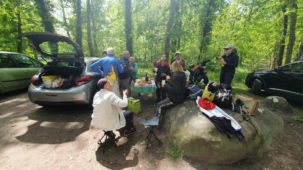 Vu l’heure avancée, les visages quelques peu marqués et les jarrets fatigués, les 4 autres bosses soient le Pignon Poteau, le Pignon Maison Poteau, le Pignon du Cassis et le Gros Sablon qui figuraient au programme sont abandonnées, sans aucune protestation ou remords !!! Il faut penser malgré tout au 3 km de retour, certes, une fois ce Pignon des Maquisards descendu, via un terrain plus propice à avaler du km !!! Et puis Il est essentiel de garder quelques forces pour lever le coude… Marie fêtant ses 80 printemps… avec quelques belles saveurs à ripailler dans son panier !!!