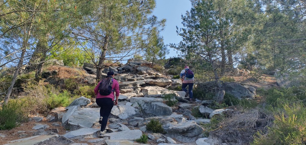 Quant au reste de la troupe, après une petite pause bien méritée, » oh hisse » pour une 7ième bosse, celle de La Platière des Marchais, pour un plus loin, après un sentier escarpé, gravir les plus ou moins 30 mètres de dénivelé de la bosse du Pignon des Maquisards et s’aérer au pied de la Croix de Lorraine !!! Et c’est là que bien 40 minutes plus tard… réapparaissent nos 2 écervelées, saines et sauves !!!