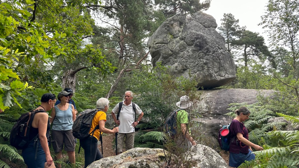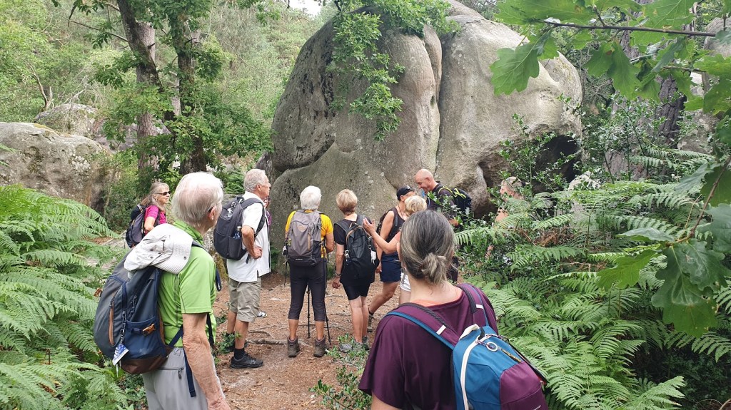 Malgré un terrain difficile et quelques gouttes de sueurs qui commencent à perler sur leurs fronts, rien n’est à déplorer, ils progressent plus ou moins aisément !!! Mais l’allégresse est là, comme toujours, on assiste même à un échange cordial, où fusent quelques boutades avec un couple de randonneurs devant le rocher l’Aérolithe (masse minérale tombée du ciel). Comme quoi, le parcours est sans souci, se fait en toute quiétude… même si il faut lever le genou, frotter ses fesses contre les grès, s’arque bouter, se déhancher, monter, descendre et… suer !!! Il y aura même une photo de famille un peu plus loin !!!