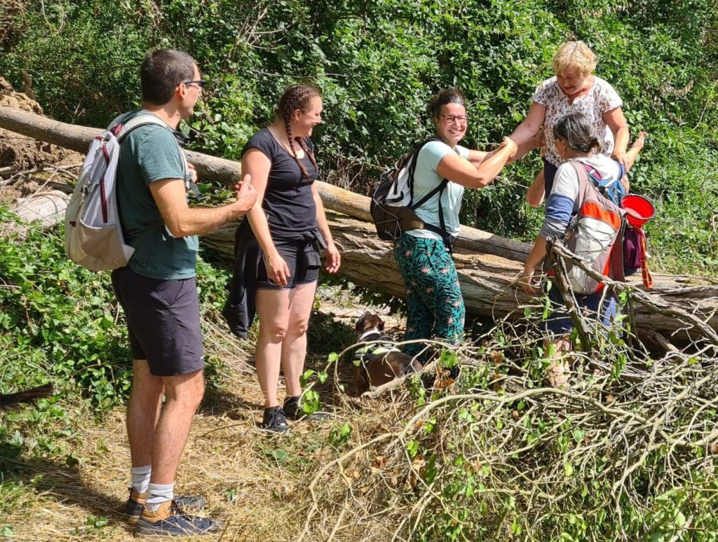 Mais que fait notre Monique à jouer l’équilibriste sur ce tronc d’arbre !!! Heureusement voilà Sandra et Patricia à la rescousse !!! S’il vous plait, prudence… n’allez pas stresser davantage notre Jacqueline… !!! N’a-t-on pas dis plus haut que tout le monde était rentré sain et sauf, sans le moindre bobo… que ce soient les nouveaux comme les anciens !!! D’ailleurs félicitons ces p’tits nouveaux, belle foulée, humour, solidarité… tout ce que les Joyeux Pataugas revendiquent !!! Et de vous à moi, c’est même Vanessa qui a dit non au raccourci proposé par Jacqueline (comme quoi elle maitrisait) pour poursuivre sur le tracé initial où figure une nouvelle grimpette !!! Comme quoi… !!! Maintenant, mais toujours de vous à moi, la seconde grimpette c’était du pipi-chat !!! Mais « cchuutt » ne le répéter pas à Vanessa !!!