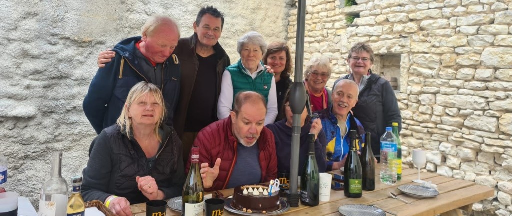 Et avouons-le pour 8,00 € de participation, l’assiette bourguignonne prévue est alléchante !!! Outre un apéritif local et ses mignardises, une belle douzaine d’escargots, accompagnée d’un Bourgogne blanc, plus un sucré… avec une part de tarte aux pommes !!! Comme quoi le Bourguignon et la Cagouille Vagabonde savent recevoir !!! Et surtout qu’ensuite…, rebelote avec le barbecue-party des p’tits Pauron agrémenté par le panier gourmand des autres Joyeux Pataugas !!! Il est sûr que ce 8 mai, aucun Joyeux Pataugas n’a capitulé, surtout qu’en apothéose, il y avait aussi les 63 bougies de Gilles !!! Il a bien fait de venir le Gilou… et surtout d’arrêter de compter fleurette dans les fourrées de Chichery, enfin j’dis ça, j’dis rien …