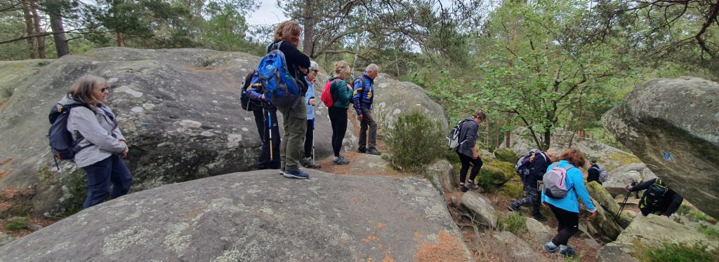 Puis après un p’tit retour dans le Rocher aux Putains, oh pardon pour le politiquement incorrect, des Demoiselles donc, Les Joyeux Pataugas cheminent Route de La Colombe, où là, ils bifurquent Route des Ypréaux, pour atteindre La Plaine des Grands Genièvres. Pour encore quelques efforts sur quelques endroits plus ou moins pentus, mais tout en en gardant sous le pied, au cas où, Route du Satyre et lors du franchissement du Rocher du Mauvais Passage, ils aient besoin de prendre leurs jambes à leurs cous !!! Sait-on jamais avec des noms pareils !!! Heureusement aucun incident fût à déplorer !!!