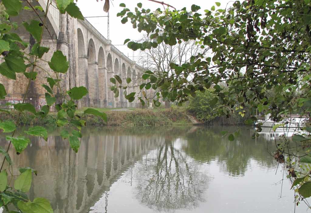 Un p’tit clin d’oeil au Viaduc de Saint-Mammès, un pont ferroviaire datant de 1846-1848, et voila nos Joyeux Pataugas arrivés à la passerelle, là ou quelques mêtres plus loin, le Loing se jette dans la Seine.