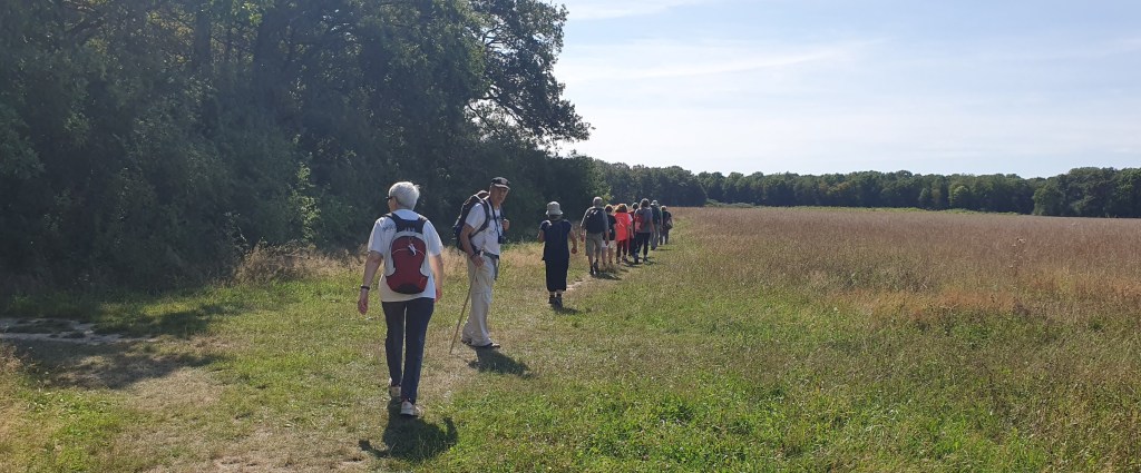 Puisque plus haut, nous avons évoqué la Beauce… vous vous doutez bien que nos Joyeux Pataugas ne peuvent que se confronter aux cultures céréalières !!! N’oublions pas que la Beauce est traditionnellement appelé le Grenier de France… donc orge, blé sont à gogo sur le parcours !!! Quelques fois longés, ou carrément traversés !!! Mais heureusement, aujourd’hui, point de canicule et de plus, il sévit un petit vent de je ne sais où, qui évitent aux Joyeux Pataugas, une belle suée !!! Car en rando, certes les grimpettes peuvent être redoutées, mais ne pas oublier ces longues étendues à travers champs sans horizon… qu’il vaut mieux traverser sous les meilleurs auspices météorologiques, été comme hiver d’ailleurs !!!