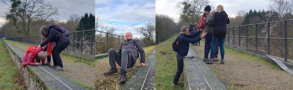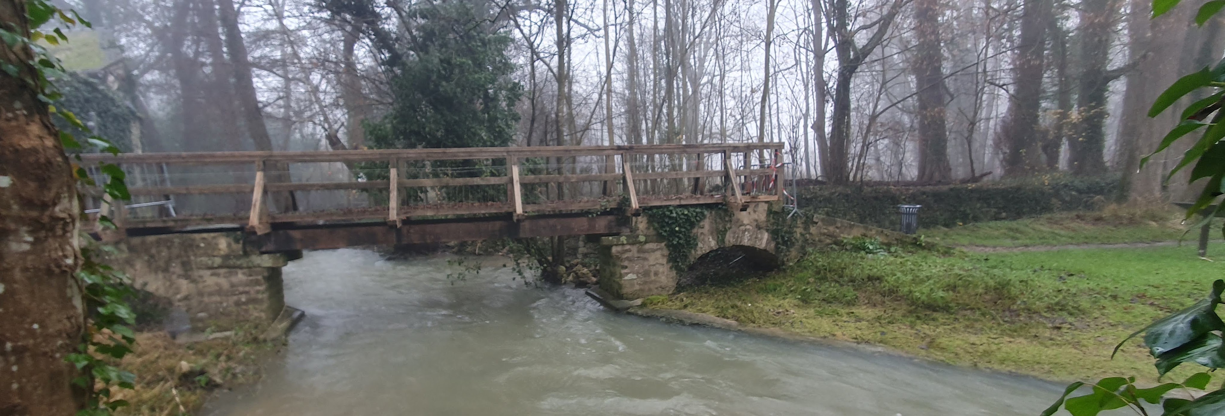 Puis, un discret clin d’œil est adressé au ru délicatement nommé “L’Écoute s’il pleut”, avant que le groupe ne pénètre dans le jardin des Essences, havre végétal propice à la contemplation… juste avant un changement de tonalité. Car soudain, en ré majeur, Pascal monte les accords avec une première grimpette, via un escalier menant sur le dos des Eaux de la Vanne. Et là, ô surprise ! Nombreux sont Les Joyeux Pataugas, forts d’un vécu riche et d’années savamment accumulées, à faire l’expérience d’une brève, mais intense remise en question de leur agilité. Un muret, pourtant haut de seulement 70 centimètres, se transforme en obstacle mythologique et le passage entre deux garde-fous, jambe levée, devient une épreuve digne des jeux antiques. Dangereusement, certes, commencent l’année 2026 nos randonneurs… mais sans chute, sans bobo, et avec l’honneur (à peu près) sauf.