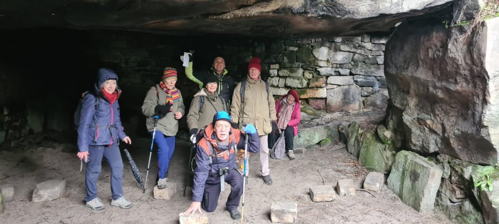 La progression les mène tout naturellement jusqu’aux fameuses Cent Marches, un escalier abrupt de grès redouté par tous les marcheurs du coin. Consciente que la fatigue pourrait embuer le flair de ses enquêteurs, Sylvie, en stratège avisé, prend la sage décision de les descendre plutôt que de les monter. Une manœuvre éclairée, car il vaut mieux préserver l’essoufflement de nos Joyeux Pataugas pour aiguiser leurs instincts et leurs capacités d’analyse. Surtout que plus loin, une grimpette se dessine, menant vers un lieu au nom tellement symbolique que le destin semble l’avoir placé là exprès : le Rocher aux Voleurs. Impossible donc, pour Les Joyeux Pataugas, de ne pas l’inspecter. Son nom résonne comme une promesse et son relief comme des caches potentielles. Imaginez bien que Les Joyeux Pataugas fouillent le moindre recoin, explorent la moindre fissure, analysent et soulèvent le moindre caillou et les feuilles suspects Mais rien, absolument rien, ils ne trouvent !!! Le bicorne, une fois de plus, se dérobe aux Joyeux Pataugas !