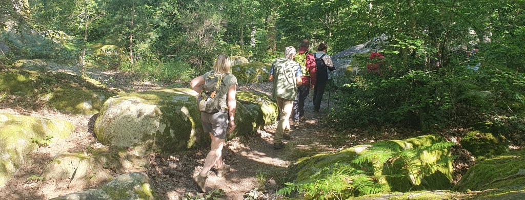 Malgré un terrain difficile et quelques gouttes de sueurs qui commencent à perler sur leurs fronts, rien n’est à déplorer, ils progressent plus ou moins aisément !!! Mais l’allégresse est là, comme toujours, on assiste même à un échange cordial, où fusent quelques boutades avec un couple de randonneurs devant le rocher l’Aérolithe (masse minérale tombée du ciel). Comme quoi, le parcours est sans souci, se fait en toute quiétude… même si il faut lever le genou, frotter ses fesses contre les grès, s’arque bouter, se déhancher, monter, descendre et… suer !!! Il y aura même une photo de famille un peu plus loin !!!