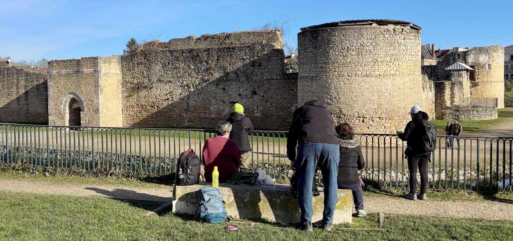 Après une immersion dans la rue du Moulin des Tours, où, adossés aux murs de l’enceinte, Les Joyeux Pataugas assistent au final de la verve de Nicolas, l’heure de la soupe avançant, le retour au Relais du Moulin Neuf, est proclamé. Il se fait par la voie verte, qui longe la route de Bordeaux où le soleil d’octobre prend des allures estivales en chauffant et dorant les visages et les sourires. Et quand le Relais du Moulin Neuf pointe son nez, quelques Joyeux Pataugas poussent un cri du cœur : “ Floc o’clock ! ”
